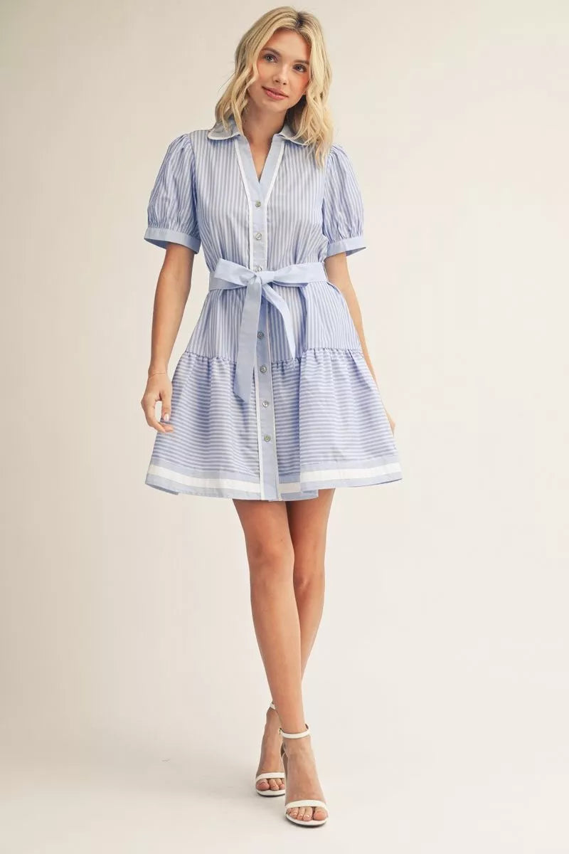 A classic blue striped button-down dress that pairs perfectly with sandals, wedges, or sneakers for an effortlessly chic boutique look.