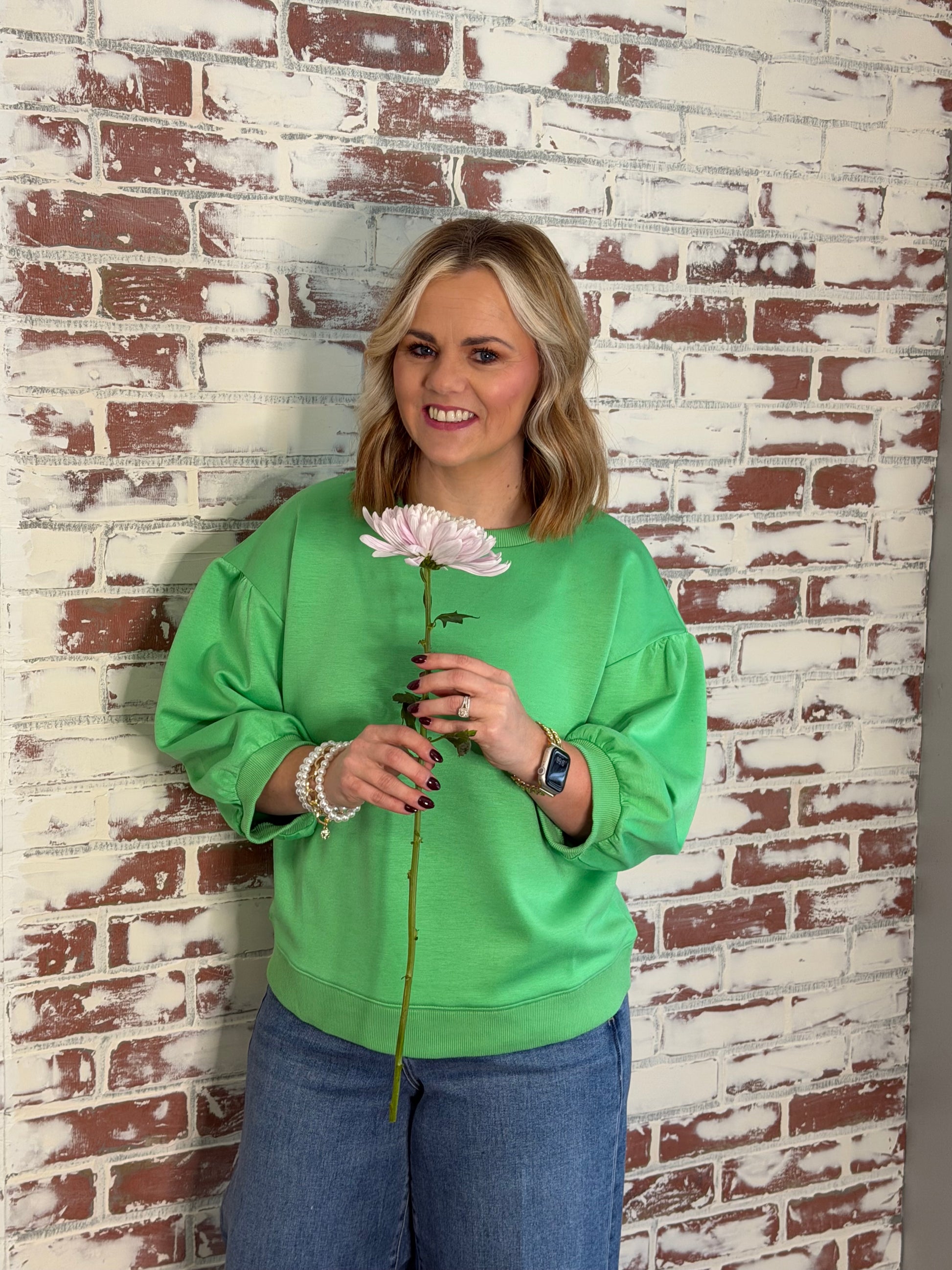 This fresh apple green top is the perfect lightweight layer for spring days. Designed with a relaxed U-neckline, drop shoulders, and three-quarter peasant sleeves, it offers an easy, effortless fit you’ll love. Finished with soft banded cuffs and a smooth, non-sheer knit, this piece is comfortable without feeling heavy—ideal for everyday wear.