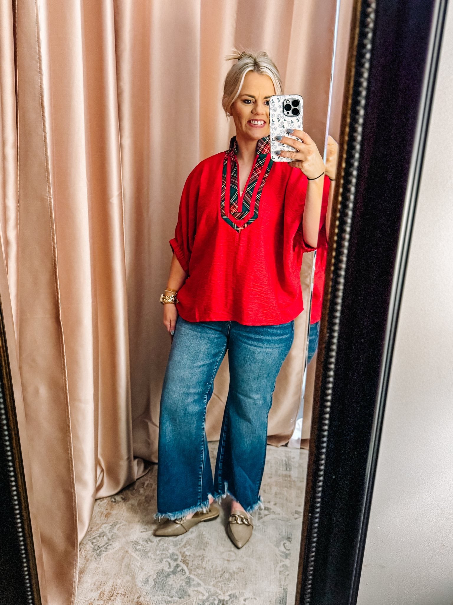 This playful short sleeve dolman top shines with a bold plaid contrast on its high V-neck band. Crafted from a lightweight woven fabric, it’s unlined and non-sheer for easy, breezy wear. Made with 85% rayon and 15% nylon, it offers comfort and style in one fun package.