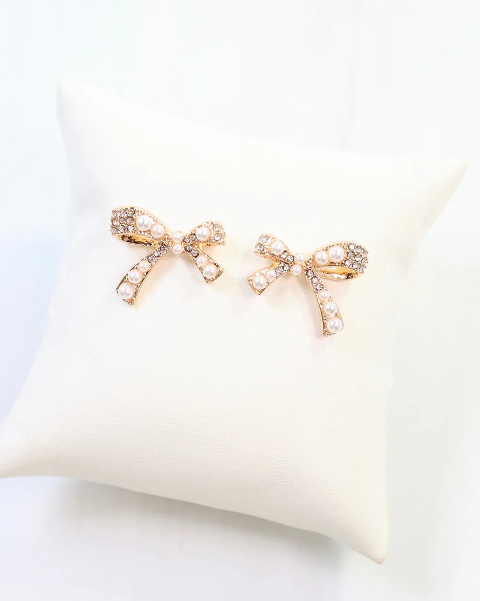 Elevate your style with the Pasadena Pearl Bow Stud in gold, combining lustrous pearls and sparkling CZ stones. This chic accessory adds a delicate yet dazzling touch to any outfit, perfect for those seeking a fashionable statement with timeless elegance.