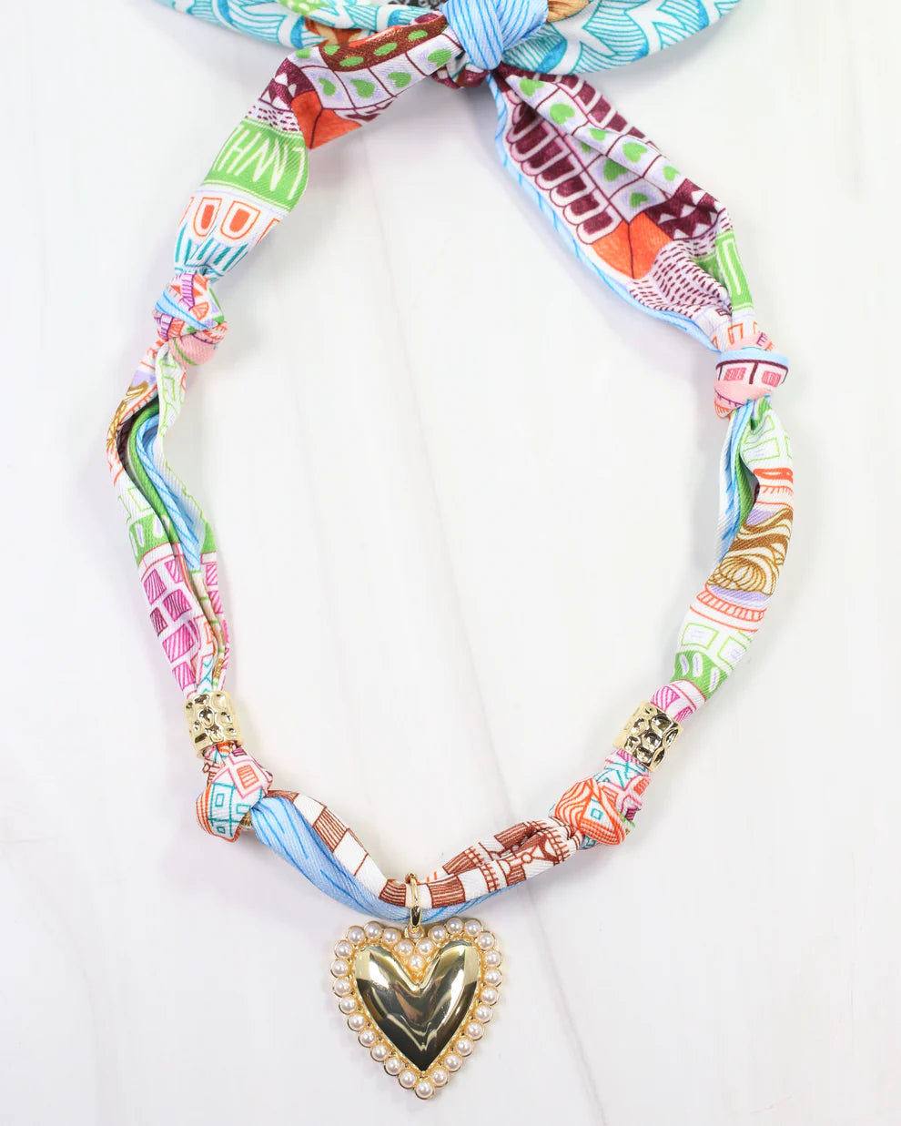 Add a splash of color and charm to any outfit with the Sullivan Scarf Charm Necklace in playful blue and orange hues. Featuring a vibrant printed scarf combined with a hammered gold spacer bead and a shiny gold heart charm accented with delicate pearls, this necklace brings a fun, whimsical touch to your look. Perfect for brightening your day with a mix of texture and sparkle!