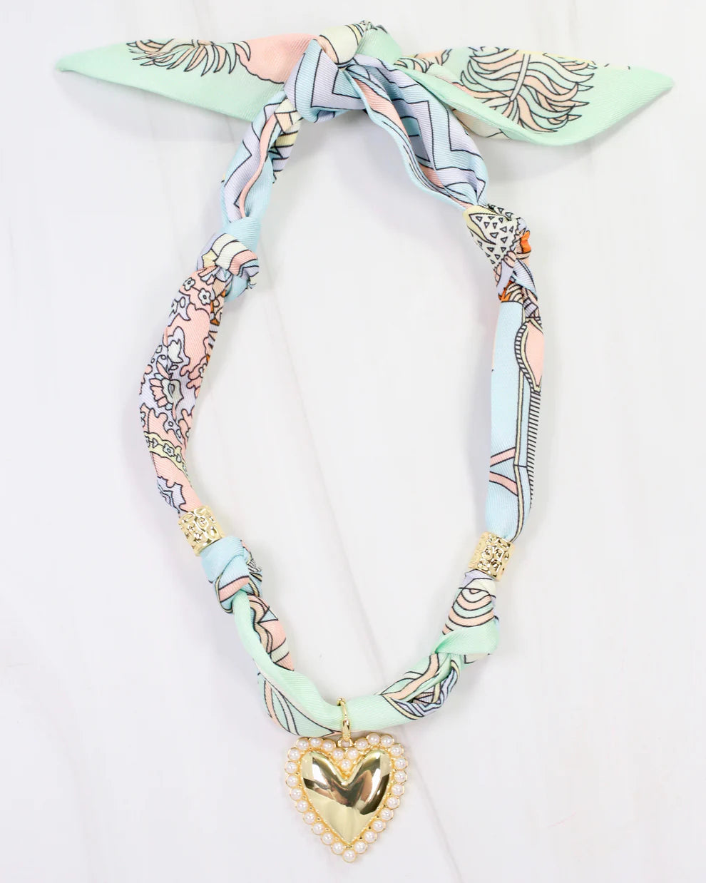 Add a splash of color and charm to any outfit with the Sullivan Scarf Charm Necklace in a serene seafoam print. Featuring a beautiful printed scarf combined with a hammered gold spacer bead and a shiny gold heart charm accented with delicate pearls, this necklace brings a fun, whimsical touch to your look. Perfect for brightening your day with a mix of texture and sparkle!