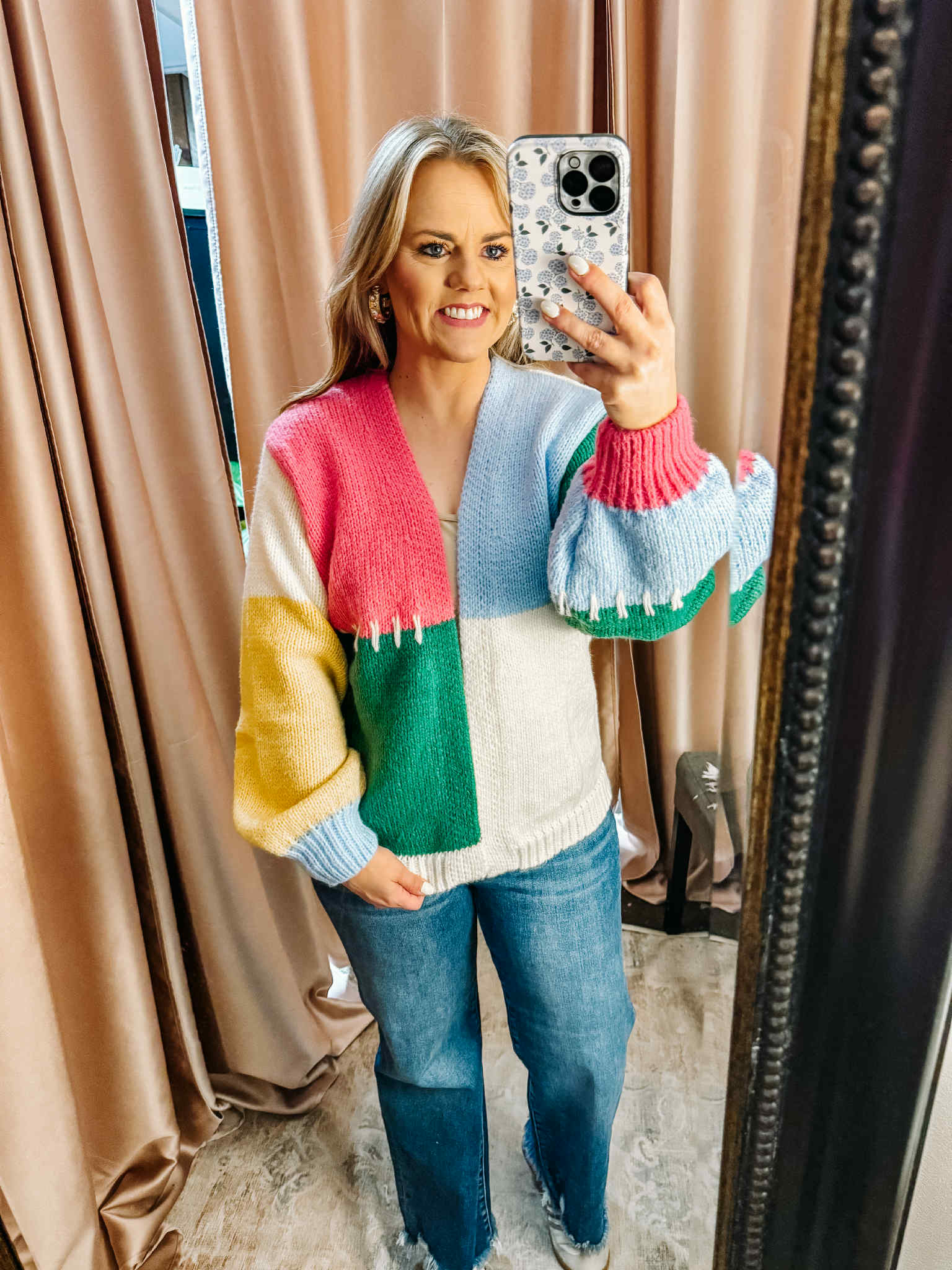 Brighten up your wardrobe with this playful colorblock knit cardigan. Featuring bold pops of pink, green, yellow, cream, and sky blue, this cozy piece is the perfect blend of fun and chic. Designed with an open-front silhouette, relaxed fit, and balloon sleeves, it layers effortlessly over your favorite tanks and tees. Whether you’re dressing it up with jeans and heels or keeping it casual with leggings and sneakers, this cardigan brings a cheerful vibe to any look.